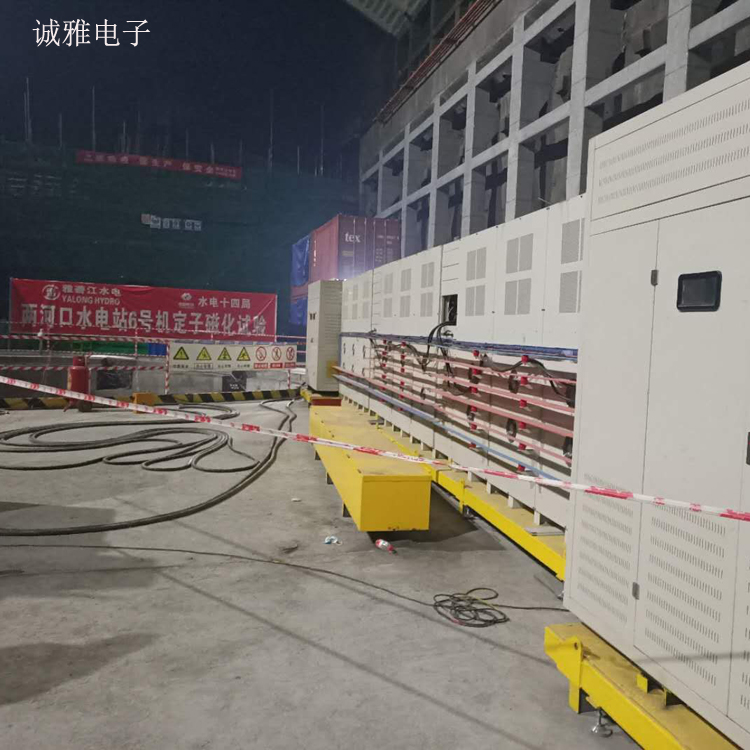 兩河口定子磁化試驗測試現場          對于大型水輪發電機組,定子鐵心是由硅鋼片現場疊裝而成.一般通過鐵心磁化試驗對其安裝水平與產品質量進行檢驗.因此,鐵心磁化試驗數據的準確性有很高的要求。大型水輪發電機的定子鐵心磁化試驗的數據非常重要。勵磁電壓的選擇、測量線圈的布置、疊壓系數的確定等因素對定子鐵心磁化試驗準確性的影響。對同類型機組鐵芯磁化試驗的準備與現場試驗提出建議,使試驗結果更加真實,可靠,有效反映鐵芯安裝水平與產品質量,提高機組運行可靠性。 目前國內此類定子測試大都采用工頻電源對定子進行測試,但由于定子實際工作頻率較寬,工頻測試不能滿足現場要求。此類大功率測試變頻電源技術多被國外壟斷,我們通過詳細了解現場工況,通過采用多機并聯技術、從機自動跟蹤技術及并聯動態均流技術,突破技術瓶頸,解決技術難題,成功設計出一款符合水電機組定子測試應用工況的高壓變頻電源。