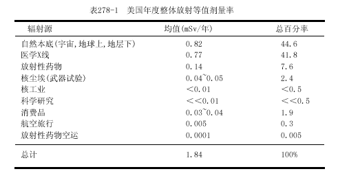 常用的測量單位是倫琴,戈瑞(Gy)和希沃特(Sv).倫琴(R)是空氣中x或γ電離輻射的計量單位,戈瑞是被各組織或物質吸收的能量計量單位,它可應用于各類輻射.R和厘戈瑞(cGy)基本上是相等的.在說明生物學效應時,Sv與經質量因子校正的Gy相等.因為對一定量的能量而言,不同類型的輻射可產生不同的生物學效應;例如,中子有較大的效應.對X和γ輻射,Sv與Gy相等.在現代術語中Gy和Sv已替代拉德(rad)和雷姆(rem),Gy=100rad,Sv=100rem.在非專業刊物中常常將輻射分為低水平輻射(0.2~0.3Gy)和高水平輻射(>0.3Gy).而醫學劑量一般為<0.05Gy,而且常常<0.01Gy.地球及其大氣的本底放射活性水平很低,而不能測知其效應(表278-1).